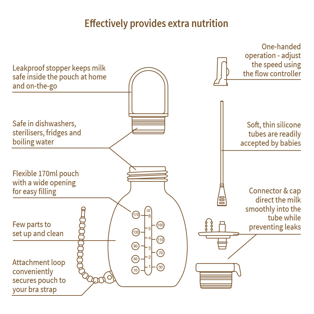 Top Tip: The Haakaa Supplemental Silicone Feeding Tube Set can be used with any baby bottle, as long as it is fitted with an X-shaped variable flow teat. Simply place the bottle above the end of the tube that is taped to your breast and let gravity do the work as your milk flows through the tube.